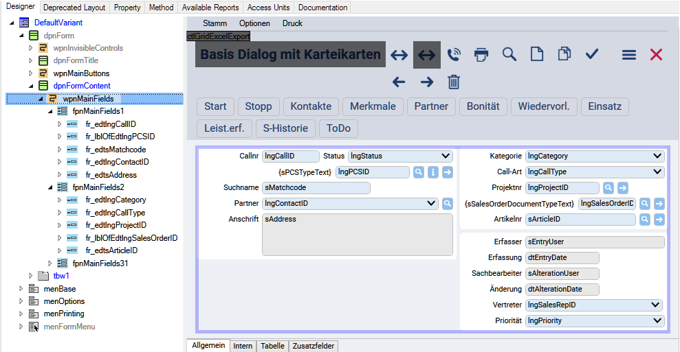 Das Form wird mithilfe von verschiedenen Containern (DockPanel, WrapPanel, FieldPanel), in denen die Controls platziert werden, strukturiert. Ausschließlich die Hierarchie und Reihenfolge der Controls definieren deren Anordnung im Form. Absolute Positionen können nicht angegeben werden.