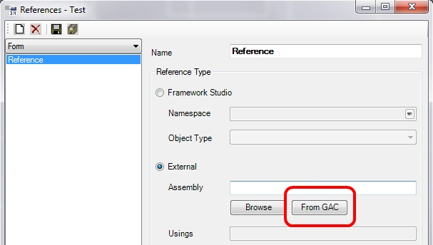 Es können Assemblies aus dem GAC (Global Assembly Cache) in Framework Studio referenziert werden.